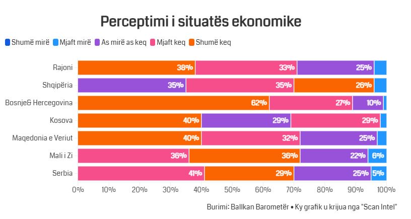 Të dhënat më të fundit të Balkan Barometer 2025 tregojnë se shumica dërrmuese e të anketuarve e vlerësojnë situatën ekonomike të vendeve të tyre si të keqe ose shumë të keqe, duke reflektuar shqetësime të forta për standardin e jetesës, fuqinë blerëse dhe pasigurinë ekonomike.