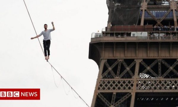 Një akrobat 27-vjeçar dhuroi një shfaqje spektakolare, për qytetarët e Parisit, pasi eci përgjatë një litari të lidhur në Kullën e Eifelit, në një lartësi prej 70 metrash.