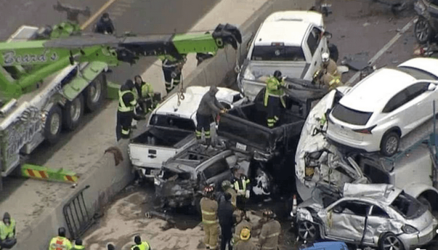 Disa dhjetra automjete prapa tij rrjedhimisht u përplasën njëra pas tjetrës teksa rrjedha e përplasjeve ishte zgjatur në 1.5 milje.