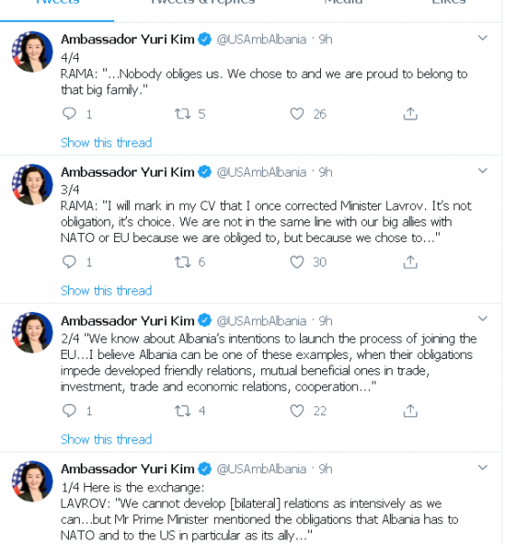 Ambasadorja amerikane në Tiranë Yuri Kim ka zgjedhur dy fraza të kryeministrit Edi Rama të bëra një ditë më parë në Moskë, gjatë takimit me ministrin e Jashtëm rus Sergei Lavrov, në të cilin ka theksuar se Shqipëria nuk është e detyruar, por ka zgjedhur të jetë në të njëjtën linjë me aleatët e saj si NATO dhe BE.