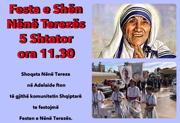 “5 Shtator 2021 ora 11:30 Shoqata Katolike Shqiptare “Nënë Tereza Adelaide”, organizon festën dedikuar shenjtores shqiptare Shën Tereza e Kalkutës. Rruzarja shenjtë, procesioni fillojnë në orën 11:30 pastaj Mesha e Shenjte në orën 12:00 qe celebrohet nga Pader Roger në Kishën Mater Christi 413 Grange Rd Seaton” shkruhet në njoftim e publikuar në Facebook nga Shoqata Katolike Shqiptare Nënë Tereza na Adelaide SA.