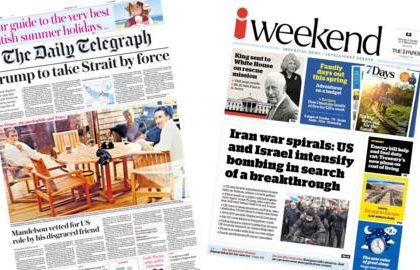 Lufta në Lindjen e Mesme dhe një foto e Andrew Mountbatten-Windsor me Jeffrey Epstein dhe Peter Mandelson dominojnë gazetat e…