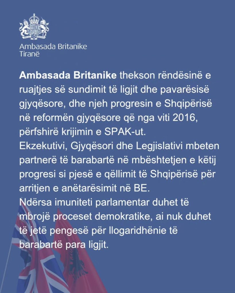 Ambasada Britanike në Tiranë ka postuar një reagim në rrjetet sociale, ku shkruhet se imuniteti nuk duhet të jetë pengesë për llogaridhënie të barabartë para ligjit.