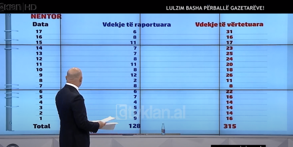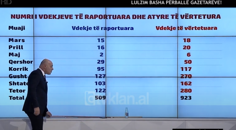 Basha: Kjo që keni përpara, ka ardhur nga një denoncim që është verifikuar me vdekjet e raportuara dhe vdekjet e ëvrtetuara në morgun e Tiranës. Vetëm në spitalet Covid, jo atyre që kanë vdekur në shtëpi. Ne disponojmë edhe emrat e viktimave
