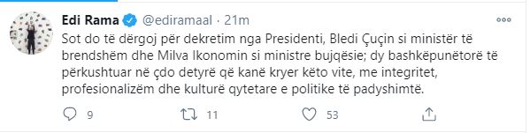 Sot do të dërgoj për dekretim nga Presidenti, Bledi Çuçin si ministër të brendshëm dhe Milva Ikonomin si ministre bujqësie; dy bashkëpunëtorë të përkushtuar në çdo detyrë që kanë kryer këto vite, me integritet, profesionalizëm dhe kulturë qytetare e politike të padyshimtë.