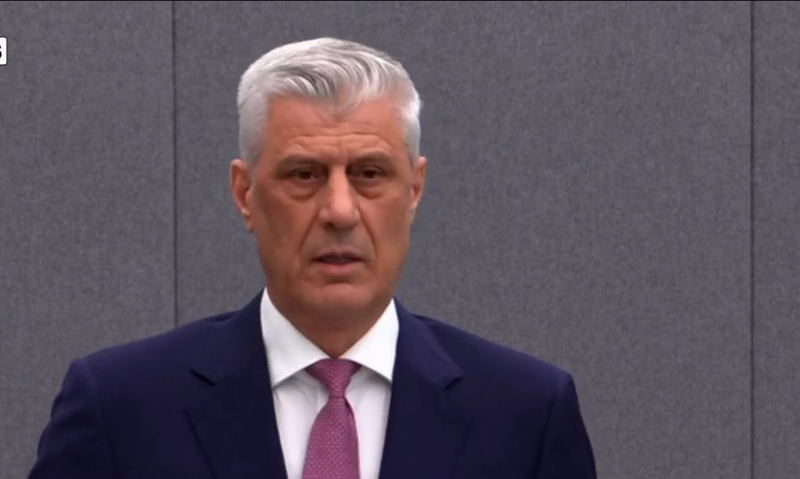 Ish-presidenti i Kosovës Hashim Thaçi po mban fjalimin e tij të fundit para togave të zeza të Hagës.