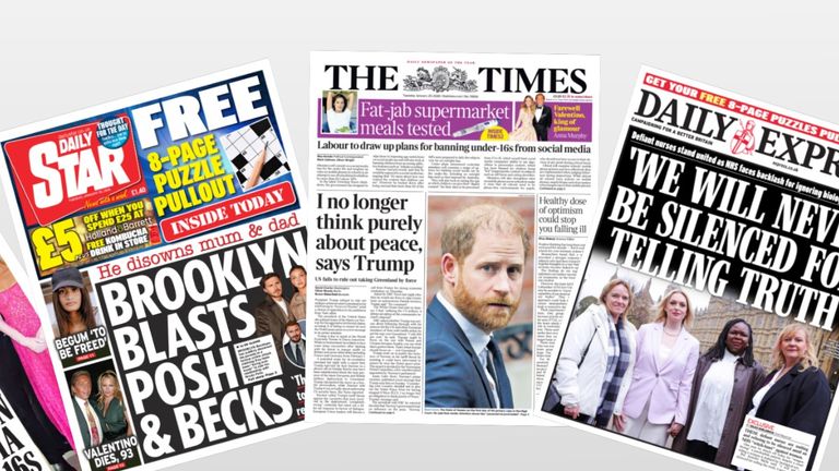 Deklarata e Brooklyn Peltz Beckham, e cila flet për marrëdhënien e tij të tensionuar me prindërit e tij, zë vend të spikatur në faqet e para të së martës. “Brooklyn bëhet bërthamor”, shkruan Daily Mail, ndërsa citon djalin më të madh të Sir David Beckham dhe Lady Victoria Beckham, i cili akuzon prindërit e tij se janë “kontrollues” dhe se vënë markën e familjes së tyre në vend të parë.“The Sun” mban të njëjtin titull si “Mail”, duke dhënë më shumë detaje nga deklarata gjashtëfaqëshe në Instagram e Peltz Beckham, ku thotë se nuk ka dëshirë të pajtohet me familjen e tij.“Brooklyn sulmon ashpër Posh dhe Becks” është qëndrimi i Daily Star. Diku tjetër, gazeta i bën homazh stilistit legjendar italian të modës Valentino, i cili ka ndërruar jetë në moshën 93 vjeç.Gazeta i Paper raporton se persona të brendshëm në NATO po paralajmërojnë se ambicia e Donald Trump për të aneksuar Groenlandën po “shkatërron besimin” dhe “po shkatërron marrëveshjet afatgjata”. Titulli sugjeron se marrëdhëniet e Mbretërisë së Bashkuar dhe SHBA-së janë në “pikën më të ulët” që nga kriza e Suezit në vitin 1956.Duke qëndruar te Donald Trump, gazeta Guardian raporton se presidenti amerikan i ka lidhur kërcënimet e tij për të marrë kontrollin e Grenlandës me dështimin e tij për të fituar Çmimin Nobel për Paqen. Në një mesazh me tekst dërguar kryeministrit norvegjez Jonas Gahr Støre të dielën, Trump tha se nuk ndiente më nevojën të mendonte “thjesht për paqen” pasi u refuzua për çmimin, thotë gazeta. Në vendin e parë të fotos është Princi Harry duke mbërritur në Gjykatën Mbretërore të Drejtësisë në Londër për gjyqin kundër Daily Mail për mbledhjen e dyshuar të paligjshme të informacionit.Gazeta Metro përqendrohet te reagimi i kryeministrit të Norvegjisë, i cili thotë se ai është përpjekur vazhdimisht t’i shpjegojë Donald Trump se nuk u refuzua qëllimisht për çmimin. Titulli është “Një idiot i çmimit”.Gazeta Times vijon me raportet se Trump ka refuzuar të përjashtojë veprimin ushtarak për të pushtuar Grenlandën, pavarësisht kundërshtimit të fortë nga aleatët evropianë. Udhëheqësi amerikan do të flasë në Forumin Ekonomik Botëror në Davos të mërkurën, ku gazeta thotë se ka të ngjarë të përballet me disa “përballje të tensionuara” me aleatët e NATO-s.“Trump vazhdon kërcënimin për konfiskimin e Grenlandës”, i bën jehonë Financial Times. Ajo përmban përgjigje nga aleatët e NATO-s, me Danimarkën që forcon trupat e saj ushtarake dhe Gjermaninë që thotë “nuk do të shantazhohemi”.Në lajme më afër vendit, lajmi kryesor i Daily Telegraph raporton konfirmimin e qeverisë se po konsultohet mbi planet për një ndalim të mediave sociale në stilin australian për adoleshentët nën 16 vjeç në Mbretërinë e Bashkuar. Gazeta thotë se vendimi përfundimtar pritet të merret në verë. Artikulli përmendet edhe në një numër faqesh të tjera të para.Së fundmi, Daily Express mbush faqen e saj të parë me një foto të katër infermierëve, të cilët kanë folur për gazetën pasi janë ankuar për një grua transgjinore që po përdorte dhomën e tyre të zhveshjes në një spital – duke çuar në një vendim të gjykatës së punës në favor të tyre.