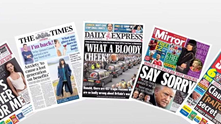 Për gazetën Guardian dhe disa nga gazetat e sotme, “fyerja” e Presidentit të SHBA-së Donald Trump ndaj trupave të NATO-s është në krye. Kryeministri britanik Sir Keir Starmer i ka kritikuar komentet e presidentit se trupat e NATO-s qëndruan larg vijave të frontit në Afganistan si “sinqerisht të tmerrshme”. Por tani, komenti i tij “rrezikon një përçarje të mëtejshme diplomatike me Shtëpinë e Bardhë”, shkruan gazeta.Daily Mirror kërkon që Trump të kërkojë falje me “më fal” për titullin pas “fyerjes” së tij ndaj heronjve të rënë britanikë. Si veteranët e plagosur ashtu edhe Princi Harry “sulmojnë” presidentin, thuhet në gazetë.Gazeta “The Independent” i bën jehonë gazetës “Miror” me thirrjen e Starmer që Trump të kërkojë falje për “shpifjen e tmerrshme ndaj të vdekurve tanë të luftës”. Gazeta nderon personelin e vrarë në luftime me foto të disa prej 457 ushtarëve.Gazeta Daily Express e quan Donald Trumpin një “fajt të mallkuar” pas komenteve të tij për NATO-n. “Donald, ka 457 arsye tragjike pse je kaq gabim”, shkruan gazeta, ndërsa pjesa e përparme e saj është e mbushur me një konvoj makinash funerale që mbanin arkivolet e trupave britanike të vrarë në Afganistan.“Tani Trump shtyn dorëzimin e Chagos” titullohet gazeta Daily Mail. Legjislacioni, i cili pritej të debatohej në Dhomën e Lordëve të hënën, do të shihte arkipelagun t’i jepej Mauritiusit, me Mbretërinë e Bashkuar që jepte me qira një bazë ushtarake për 101 milionë paund në vit. Por debati është tërhequr “vetëm disa ditë” pasi presidenti “e kritikoi Mbretërinë e Bashkuar për ‘një akt të budallallëkut të madh'”, shkruan gazeta, duke thënë se ky veprim ngjall “shpresën për një kthesë të 15-të”.Gazeta Daily Telegraph thotë se Kryeministri i Mbretërisë së Bashkuar, Sir Keir Starmer, është “detyruar” të tërheqë projektligjin për Ishujt Chagos pas “reagimit të ashpër të SHBA-së ndaj marrëveshjes”. Gjithashtu, në faqen e parë të tij, “testet gjenetike për kancerin do të vijnë në NHS”.The Sun ka publikuar të rejat më të fundit mbi Brooklyn Beckham dhe familjen e tij të famshme. Në një ekskluzivitet, gazeta thotë se gruaja e tij Nicola Peltz i tha “ose unë ose ajo, nuk mund t’i kesh të dyja” pasi “u ndje i lënë pas dore nga nëna e tij Victoria në dasmën e tyre”.Të rinjtë me gjendje “normale” të shëndetit mendor po “nxirren nga lista”, tha autori i një vlerësimi mbi Neets – të rinjtë që nuk janë në arsim, punësim ose trajnim. Ish-ministri i kabinetit laburist, Alan Milburn, i tha gazetës Times se si rezultat, Mbretëria e Bashkuar po përballet me një “brez të humbur” të të rinjve të moshës 16-24 vjeç.Çmimi i arit është rritur ndjeshëm pasi “Grenlanda e Trump-it lëviz me çmime të ulëta”, shkruan Financial Times. Më afër vendit, një “grusht klientësh super të pasur” kanë blerë baret e fshatrave “në vështirësi” të Britanisë – përfshirë familjen Rothschild.Daily Star lë të kuptohet një zbulim i madh për finalen e sezonit të serialit “Tradhtarë” me “Sekretin e Tradhtarëve të Claudias”. Por në vend të kësaj zbulon “trukun prapa skenave të prezantueses televizive për nxirjen”.,Një komplot kundër Starmer dhe Streeting kryeson The i Paper, pasi thotë se “figurat kyçe” në Partinë Laburiste mbështesin rikthimin e Andy Burnham në Dhomën e Komunave, ndërsa rriten pritjet se ai do ta sfidojë kryeministrin për lidership. Ata në të majtë të partisë “kanë frikë nga një ‘kurorëzimi i Wes Streeting'”, shkruan ajo.