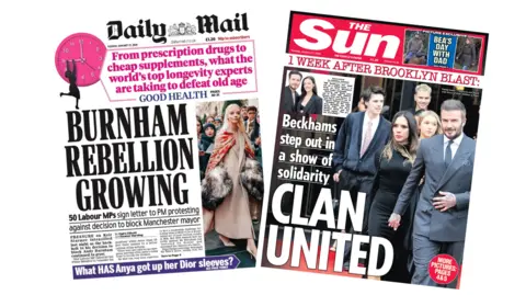 Pasojat pas vendimit për të bllokuar Andy Burnham nga kandidimi në zgjedhjet e ardhshme të pjesshme kanë vazhduar, me gazetën Mail që raporton një rebelim në rritje midis zyrtarëve qeveritarë. Raportohet se 50 deputetë kanë nënshkruar një letër proteste kundër vendimit, duke vënë në dukje se presioni mbi kryeministrin Sir Keir Starmer është “intensifikuar”.Gazeta Times thotë se figura të larta të Partisë Laburiste kanë “pranuar privatisht” se presin të humbasin zgjedhjet e pjesshme në Gorton & Denton si rezultat i bllokut Burnham. Gazeta thotë se lufta për vendin “ka të ngjarë të jetë thellësisht përçarëse”, me të Gjelbrit dhe Reform UK “të vendosur të shtojnë presionin” mbi Sir Keir. Kryeministri ka mbrojtur vendimin e tij në lidhje me Burnham, duke këmbëngulur se lejimi i tij për të kandiduar për vendin do të “shmangte burimet tona” nga fushatat “shumë të rëndësishme” në zgjedhjet e majit.Disa gazeta e kanë fotografuar ish-futbollistin e Manchester United, Sir David Beckham, dhe familjen e tij në një ceremoni çmimesh në Paris, pasi Lady Beckham u bë Kalorës i Urdhrit të Arteve dhe Letrave. Nën titullin “Klani i bashkuar”, gazeta “Sun” e quan këtë një “shfaqje solidariteti”, duke vënë në dukje se është hera e parë që familja është parë së bashku pas grindjes me Brooklyn, djalin e madh, në Instagram javën e kaluar. Çiftit iu bashkuan edhe tre fëmijët e tjerë – Romeo, Cruz dhe Harper.“Ti je gjithçka për mua”, deklaron Star, duke shoqëruar foton e familjes në Paris me një citat nga postimi i Lady Beckham në Instagram për të shënuar pranimin e saj të titullit kalorës.Edhe pse familja Beckham është gjithashtu në qendër të gazetës Guardian, titulli i gazetës thotë: “Konservatorët përballen me reagime të ashpra pas talljes së ‘shëndetit mendor’ për shkak të largimit të Braverman”. Raportohet se Partia Konservatore u detyrua të korrigjonte të dhënat pasi fillimisht thanë se Suella Braverman kishte kaluar te Reform UK për shkak të problemeve të ‘shëndetit mendor’. Në një deklaratë të re, partia tha se versioni origjinal kishte qenë një version draft i dërguar gabimisht.Një Braverman plot buzëqeshje dhe udhëheqësi i Reform UK, Nigel Farage, janë shfaqur në të gjithë gazetën Mirror, të shoqëruar me titullin “Mashtrimi më i fundit i Reform”.Gazeta i Paper thotë se deklarata në lidhje me Braverman vjen në mes të një eksodi në rritje të partisë Konservatore. Faqja e parë gjithashtu paraqet Farage duke thënë se Konservatorët përballen me një “katastrofë” në zgjedhjet e majit.“Më shumë marrëveshje transferimesh për janarin!” deklaron Metro, duke shënuar si largimin e Braverman ashtu edhe një kast të azhurnuar për The Great British Bake Off. Kjo konfirmon se Nigella Lawson do të zëvendësojë Prue Leith në serialin e ardhshëm të shfaqjes së dashur televizive.Çmimi i arit kryeson numrin e së martës të Financial Times, pasi arriti në 5,000 dollarë për ons troy për herë të parë. Gazeta thotë se të hënën dollari amerikan ra gjithashtu në nivelin më të ulët në katër muaj, mes frikës së një mbylljeje tjetër të qeverisë.Gazeta Telegraph thotë se Kina ka hakuar telefonat celularë të zyrtarëve të lartë në Downing Street për “disa vite”, si pjesë e një operacioni që gazeta e kupton si “të kompromentuar anëtarë të lartë të qeverisë”. Pretendimet e mëparshme për hakimin e telefonave u hodhën poshtë nga Kina si “të pabaza”.Eva Clarke, 80 vjeç, e mbijetuara e Holokaustit, ka dhënë një intervistë për gazetën Express me rastin e Ditës së Përkujtimit të Holokaustit, duke i thënë gazetës se ajo ende shpreson për një të ardhme më të mirë nëse njerëzit mund t’i kundërvihen paragjykimeve dhe të përballen me antisemitizmin në rritje.