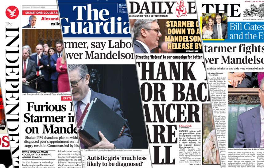 “Kryeministri lufton për mbijetesë” është titulli kryesor i gazetës Metro mbi emërimin e Lord Mandelson si ambasador në SHBA nga Sir Keir Starmer. Në kohën e emërimit, ishte e ditur publikisht se Mandelson kishte ruajtur një miqësi me pedofilin Jeffrey Epstein pas dënimit të tij për nxitje seksuale nga një e mitur. Sir Keir u ka thënë kritikëve “ju po ndihmoni Reformën” duke diskutuar çështjen, sipas Metro. BBC kupton se pikëpamja e Lord Mandelson është se ai iu përgjigj pyetjeve në lidhje me marrëdhënien e tij me Epstein në procesin e verifikimit me saktësi. Lord Mandelson nuk u është përgjigjur kërkesave për koment, por BBC kupton se qëndrimi i tij është se ai nuk ka vepruar në asnjë mënyrë kriminale dhe se nuk ishte i motivuar nga përfitimi financiar.
