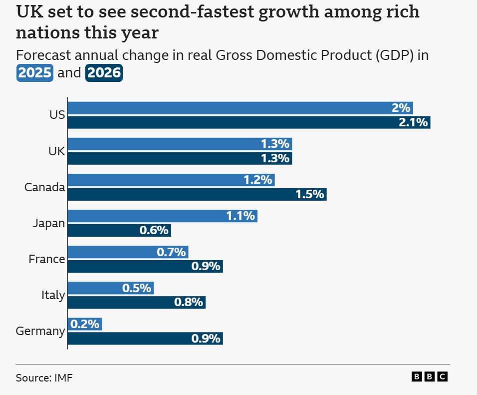 FMN parashikon që në vitin 2025 ekonomia e Mbretërisë së Bashkuar do të tejkalojë ekonomitë e tjera të G7, përveç SHBA-së, në atë që ka qenë një vit i nxehtë për tregtinë dhe tensionet gjeopolitike.