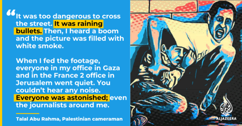 Në Saladin Road, në jug të Gazës, kameramani palestinez Talal Abu Rahma filmoi një skenë që do të shënonte historinë: babai Jamal al-Durrah teksa përpiqej të mbronte me trupin e tij djalin 12-vjeçar, Muhammad, teksa plumbat binin si shi mbi ta.