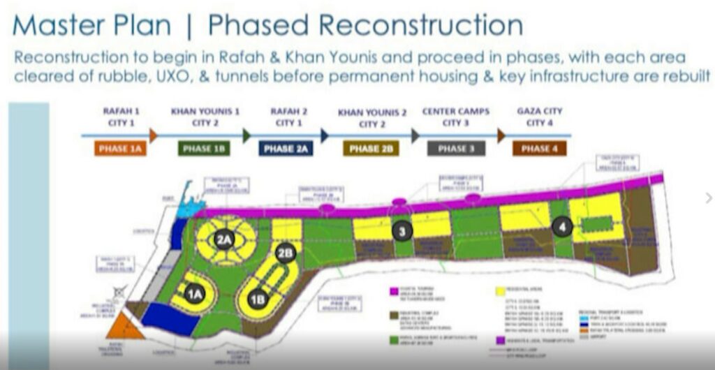 Rindërtimi parashikohet të kalojë në katër faza, duke nisur nga Rafahu në jug, për t’u shtrirë më pas drejt veriut në Qytetin e Gazës. Megjithatë, projekti ka një kusht të panegociueshëm: përmbylljen me sukses të fazës së dytë, që është në prag të nisjes, çarmatimin e plotë të Hamasit dhe shkatërrimin e të gjitha tuneleve.