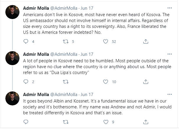 “Amerikanë s’jetojnë në Kosovë. Shumica e tyre kurrë s’kanë dëgjuar për Kosovën. Ambasadori i SHBA-së nuk duhet ta përfshijë veten e tij në punët e brendshme të Kosovës. Secili vend ka të drejtë për sovranitetin e vet pavarësisht madhësisë. Franca e ka çliruar Amerikën, por a është SHBA-ja gjithmonë borgjlike? Jo.”, ka shkruar Molla.