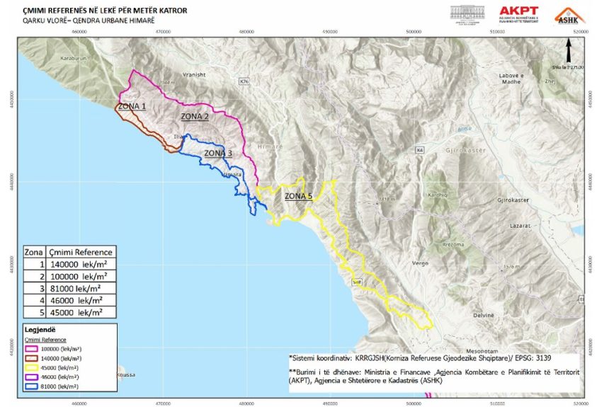 Ndërsa zona rurale e Vlorës që shtohet si zonë e re nr.8, përfshirë edhe atë të Radhimës (pa vijën e parë bregdetare) do të ketë çmim reference 61,800 lekë për metër katror, i barabartë me çmimin aktual të zonës së qytetit për Bashkinë Vlorë.