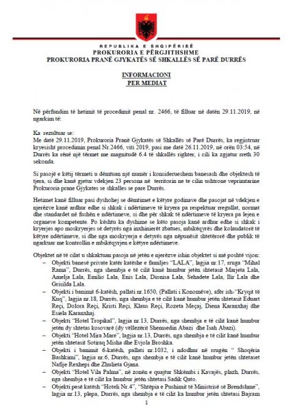 Ndërsa po bëhet një vit nga tërmeti shkatrrmtar i 26 nëntorit, prokuroria e Durrësit bën me dije se ka përfunduar hetimet.