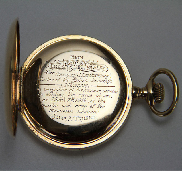 “Nga Presidenti i Shteteve të Bashkuara për Charles J Lawrenson, kapiteni i avullores britanike Nubian, në nderim të shërbimeve humane për shpëtimin në det të ekuipazhit të anijes amerikane Julia A Trubee, më 7 mars 1914”, shkruhet në mesazh.
