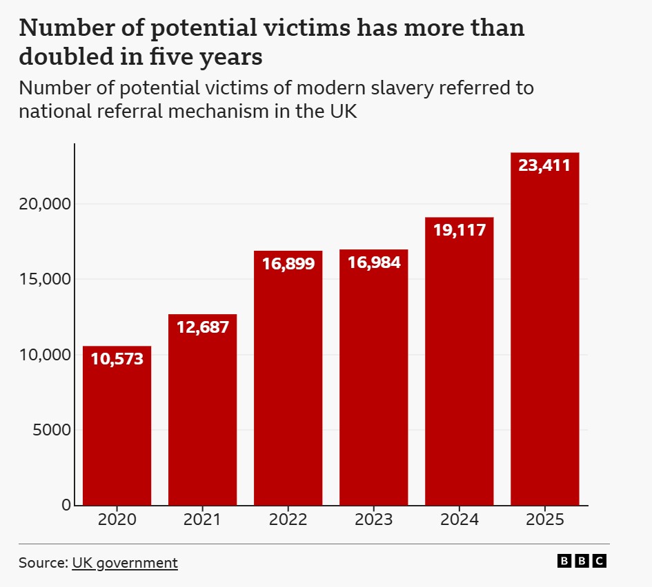Rritja e rasteve pasqyrohet në të gjithë vendin. Në vitin 2025, numri i viktimave të mundshme të skllavërisë moderne të referuara në Mekanizmin Kombëtar të Referimit (NRM) në Mbretërinë e Bashkuar ishte më shumë se dyfishi i atij të vitit 2020, duke arritur një nivel rekord.