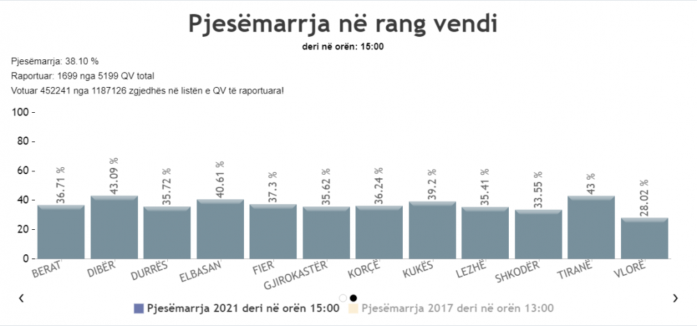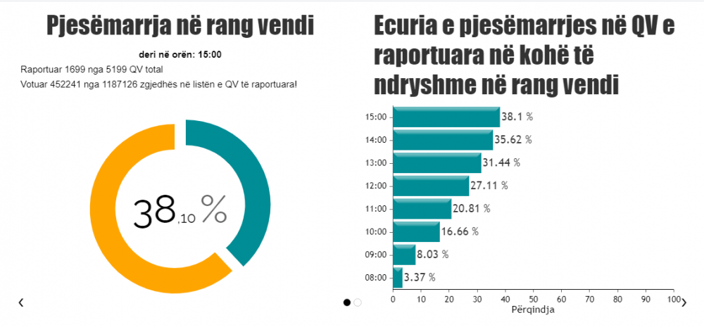 Sipas raportimit të fundit nga i gjithë vendi, pjesëmarrja në gjithë Shqipërinë deri në orën 15:00 ka shkuar në nivelin e 38.10 %.