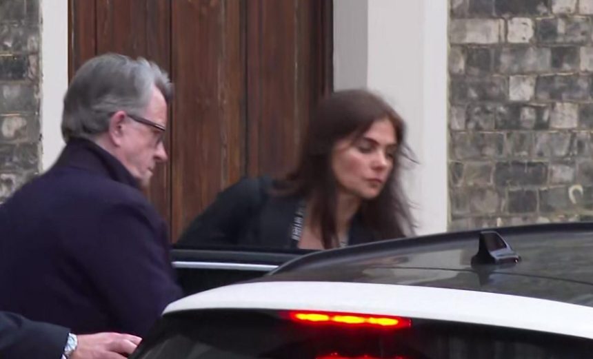 Lord Peter Mandelson shoqërohet nga një oficer policie jashtë shtëpisë së tij.