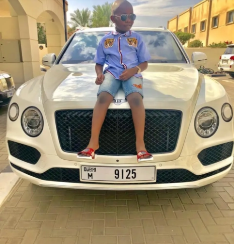 Në një postim ai shfaqet mbi kofanon e një Bentley Flying Spur të cilën babai ia ka blerë si makinë e tij të parë.