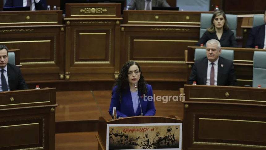 Presidentja e Kosovës, Vjosa Osmani, në seancën solemne të Kuvendit të Kosovës me rastin e 28-vjetorit të Epopesë së Ushtrisë Çlirimtare të Kosovës (UÇK), foli për rëndësinë historike të muajit mars 1998 dhe sakrificën e familjes Jashari në Prekaz.