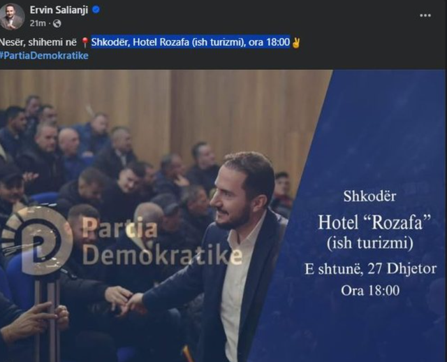 “Nesër, shihemi në Shkodër, Hotel Rozafa (ish turizmi), ora 18:00,” shkruan Salianji në Facebook.