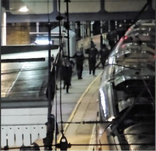 Policia mund të shihet duke vrapuar në platformë pranë një treni të ndaluar, ndërsa disa ambulanca mbërrijnë në stacion.