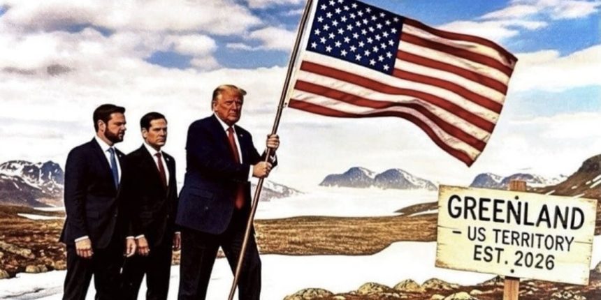 Në një postim tjetër, Trump ndau një grafik që dukej se paraqiste Sekretarin e Shtetit Marco Rubio dhe Zëvendëspresidentin JD Vance duke qëndruar pas tij, ndërsa ai mbante një shtizë me flamurin amerikan pranë një tabele ku Groenlanda përshkruhej si “TERRITOR I SHBA-së, THEM. 2026”.