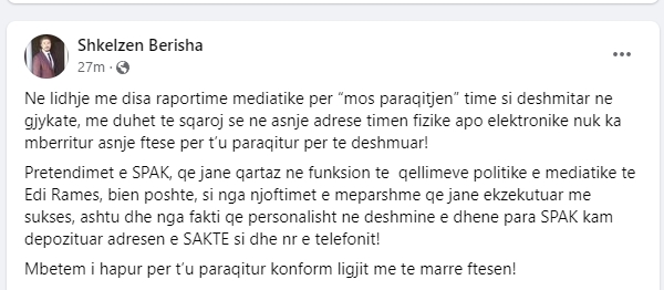 “Ne lidhje me disa raportime mediatike per “mos paraqitjen” time si deshmitar ne gjykate, me duhet te sqaroj se ne asnje adrese timen fizike apo elektronike nuk ka mberritur asnje ftese per t’u paraqitur per te deshmuar! Pretendimet e SPAK, qe jane qartaz ne funksion te qellimeve politike e mediatike te Edi Rames, bien poshte, si nga njoftimet e meparshme qe jane ekzekutuar me sukses, ashtu dhe nga fakti qe personalisht ne deshmine e dhene para SPAK kam depozituar adresen e SAKTE si dhe nr e telefonit! Mbetem i hapur per t’u paraqitur konform ligjit me te marre ftesen!”, shkruan ai.