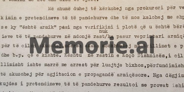 Kështu në rastin e Koço Dishnicës, i cili fillimisht është marrë në arrest për luajtje bixhozi, përfundimisht do të akuzohej për agjitacion e propagandë armiqësore. Nga dëgjimi me kujdes i pretendimeve të të pandehurve, rezultoi se provat ishin të krijuara dhe jo të dëgjuara siç pasqyroheshin në materialet e çështjes hetimore, përfundimisht i pandehuri u dërgua në gjyq vetëm me kundravajtjen e bixhozit.