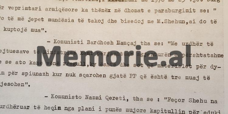 Komunisti Nazmi Qerreti, tha se: “Feçor Shehu na ka urdhëruar të heqim nga plani i punës mujore, kapitullin për edukimin ideo-politik dhe detyrat që shtron Partia për ne”.