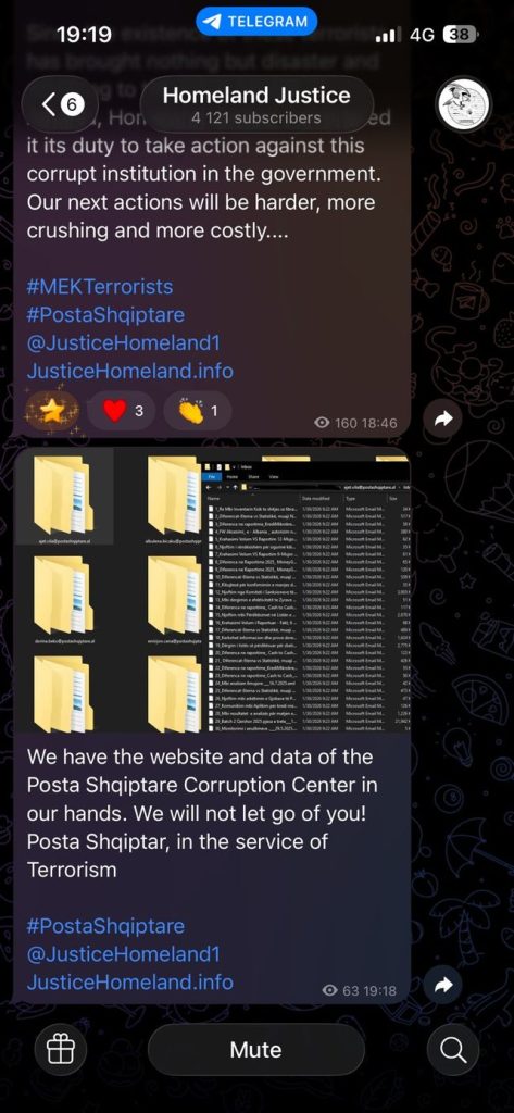 Posta Shqiptare u sulmua nga Patriotët e Homeland Justice për shkak të bashkëpunimit të vazhdueshëm dhe të qëndrueshëm me terroristët e Muxhahedinët e Popullit të Iranit dhe për lehtësimin e rrugës së veprimeve të këqija dhe akteve terroriste të këtij grupi.
