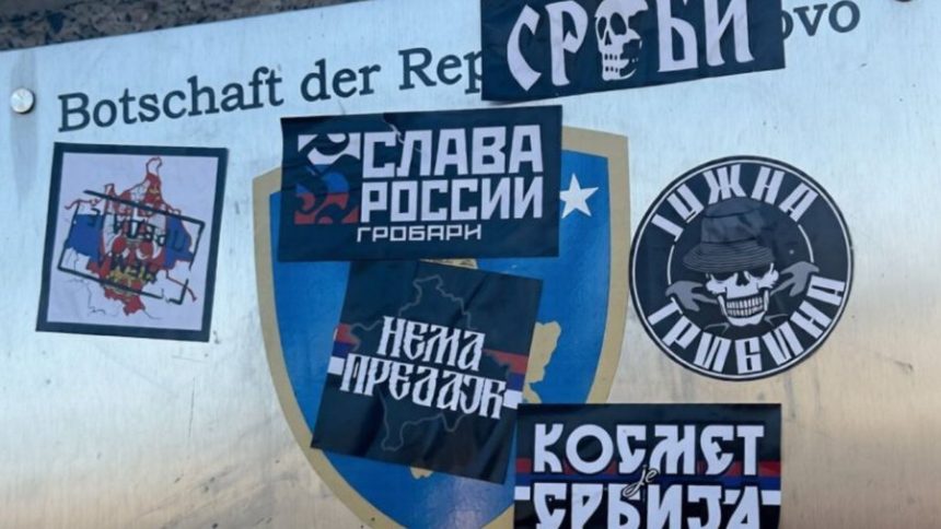 Këto janë thirrjet fyese me përmbajtje shoviniste me të cilat u sulmua ditën e sotme Ambasada e Republikës së Kosovës në Berlin. Këto etiketa u vendosën në pllakën identifikuese të objektit diplomatik.