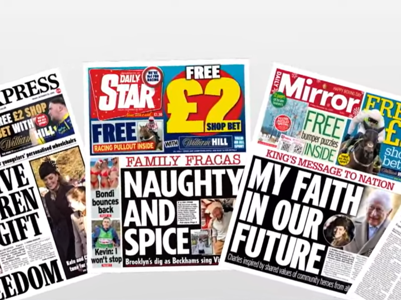 Gazeta Daily Express po feston thirrjen e saj për Krishtlindje në faqen e saj të parë, duke thënë se lexuesit e saj kanë mbledhur më shumë se 100,000 paund për organizatën bamirëse për karriget me rrota për fëmijë Whizz Kidz. Paratë e mbledhura do të ndihmojnë në blerjen e 20 karrigeve me rrota të personalizuara ose mjeteve të tjera ndihmëse që ndryshojnë jetën dhe që do t’u japin fëmijëve më shumë liri, sipas gazetës. Gjithashtu, në faqen e parë shfaqet Princesha e Uellsit dhe Princesha Charlotte, ndërsa marrin pjesë në shërbesën kishtare të Ditës së Krishtlindjeve.