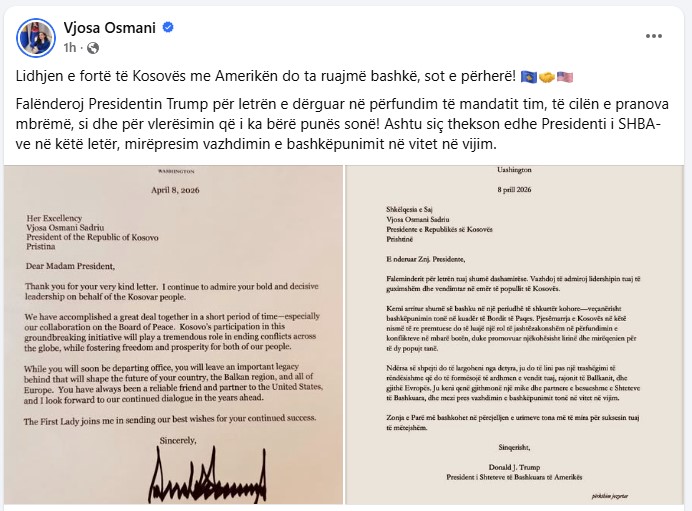 Presidenti Amerikan , Doanld Trump i ka dërguar një letër ish-presidentes së Kosovës, Vjosa Osmani, në përfundim të mandatit të saj. Nëpërmjet kësaj letre, të cilën Osmani e ka pranuar ditën e djeshme, theksohet bashkëpunimi i saj në kuadër të Bordit të Paqes.