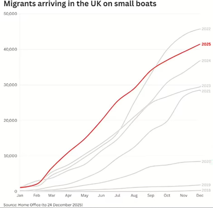 Një grafik i zymtë tregon se viti 2025 do të regjistrojë numrin e dytë më të lartë të njerëzve që kalojnë Kanalin Anglez me anije të vogla në vitet e fundit, me vetëm një javë të vitit të mbetur.