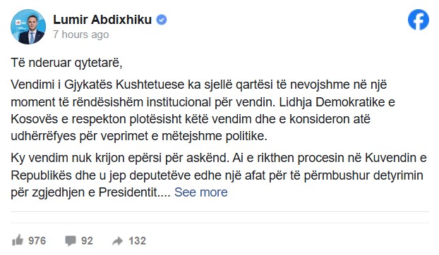 Kryetari i LDK-së, Lumir Abdixhiku përmes një postimi në “Facebook” ka reaguar lidhur me vendimin e Gjykatës Kushtetuese e cila rrëzoi dekretin e Osmanit për shpërndarjen e Kuvendit dhe u dha kohë deputetëve që brenda 34 ditëve të zgjedhin presidentin e ri të vendit.