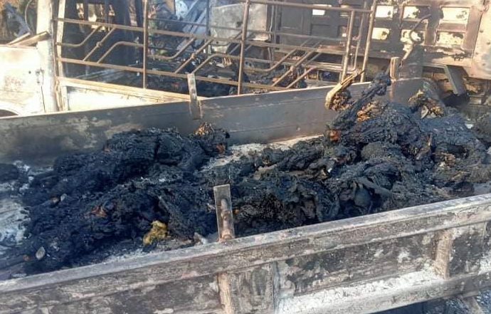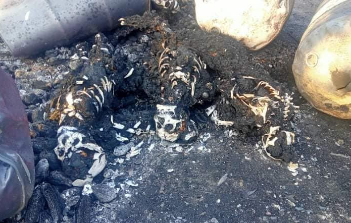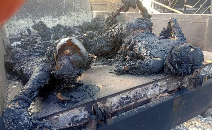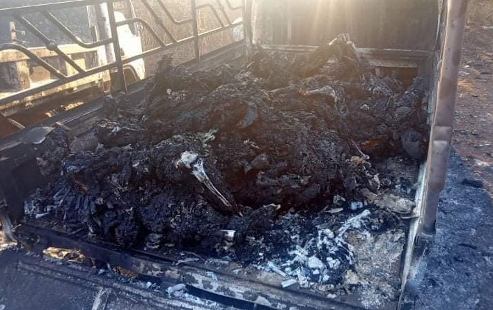 Fotografitë e shpërndara nga grupi për të drejtat e njeriut dhe mediet lokale shfaqën mbetje të djegura të trupave në disa automjete.